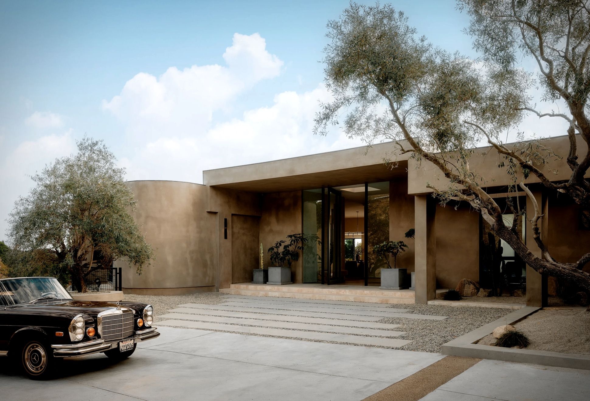 The single-story design blends lime-washed plaster, travertine, and rich wood tones for a warm, grounded aesthetic. Curved walls, arched openings, and expansive glass bring in light while connecting the interiors to the serene landscape by Michelle Shofet, where olive trees and native grasses seamlessly integrate the home with its surroundings.